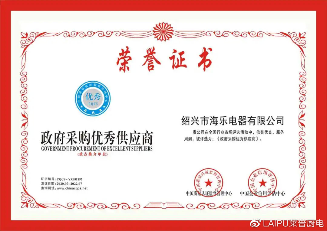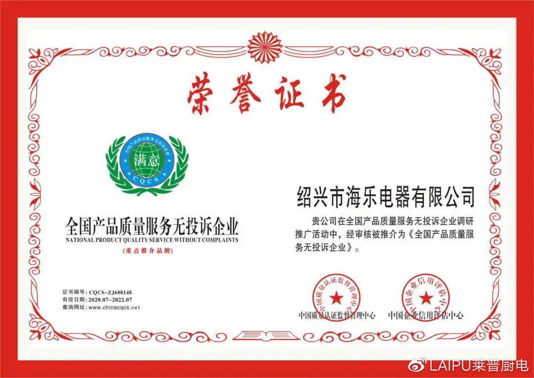 7月16日海乐电器有限公司(91看片APP永久免费厨电)荣获“中国3.15诚信企业、政府采购优秀供应商、全国产品质量服务无投诉企业”三项荣誉证书以及“国际标准产品标志证书”、“中国节能产品认证证书”。